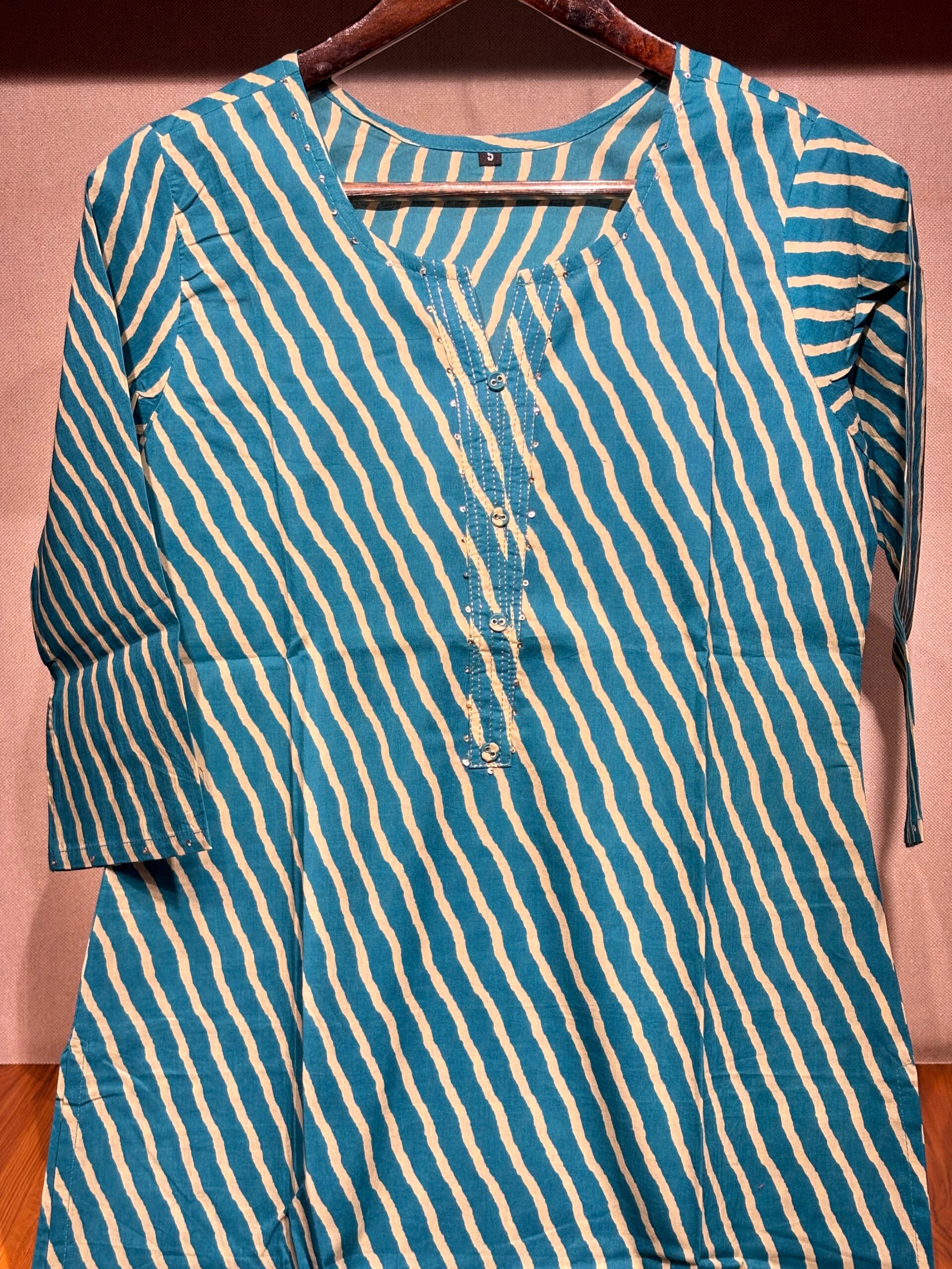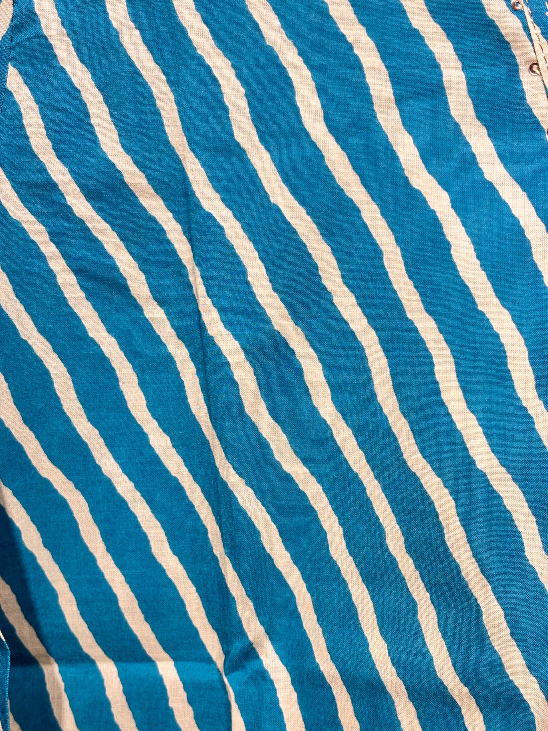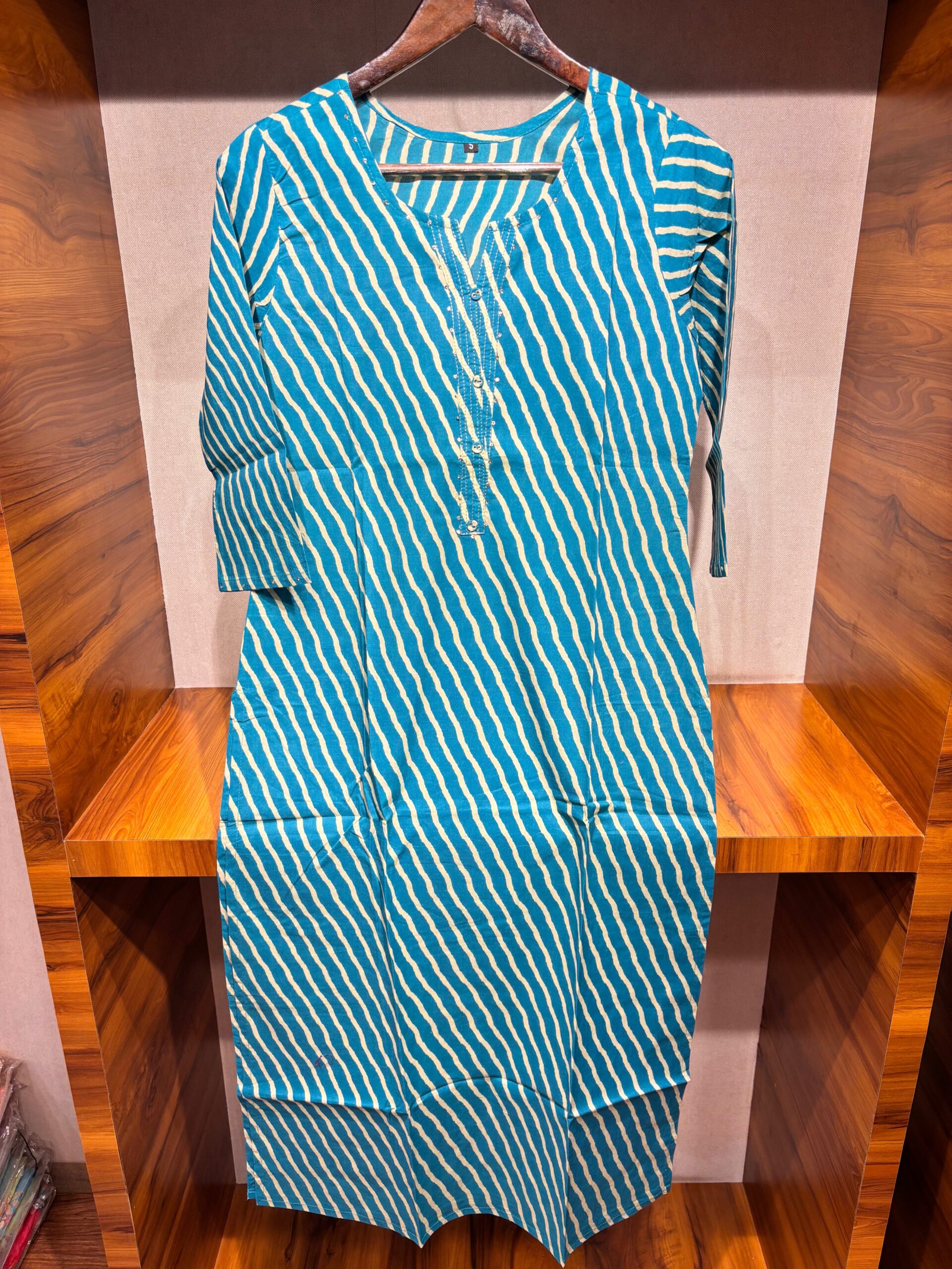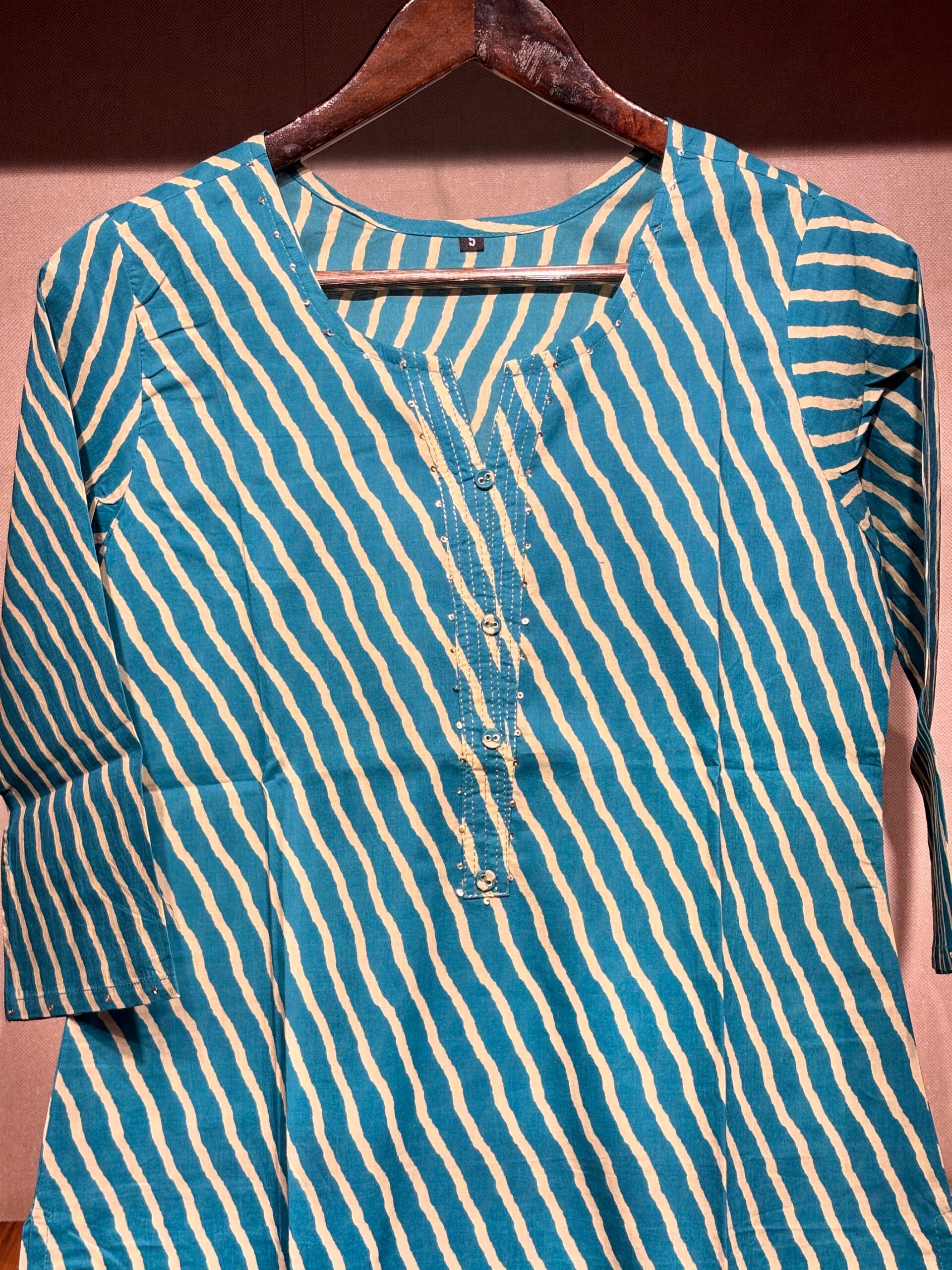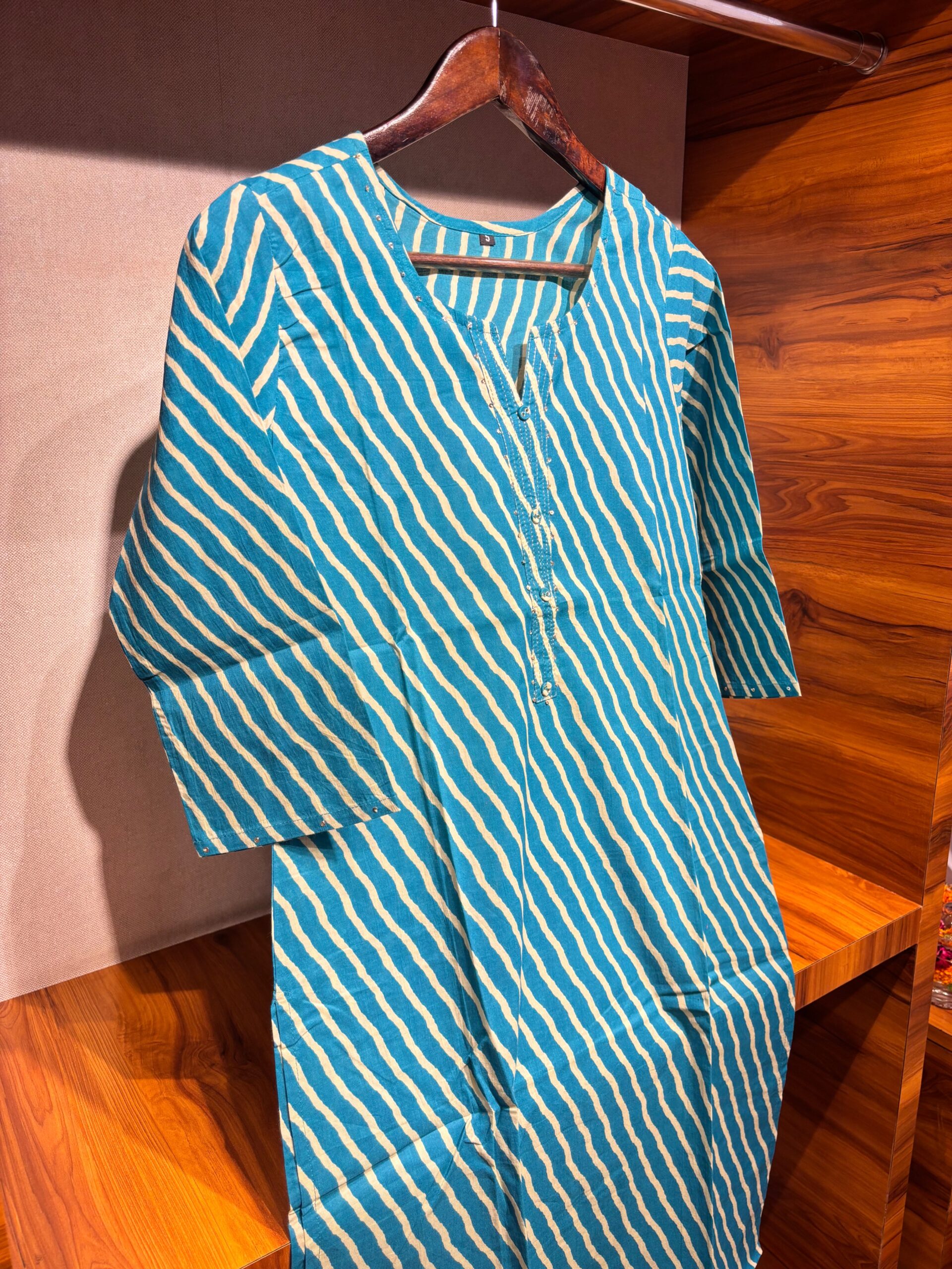 Elevate your ethnic style with this Yunara blue cotton kurti featuring a classic white lehriya print. Soft, breathable, and perfect for casual or festive occasions.