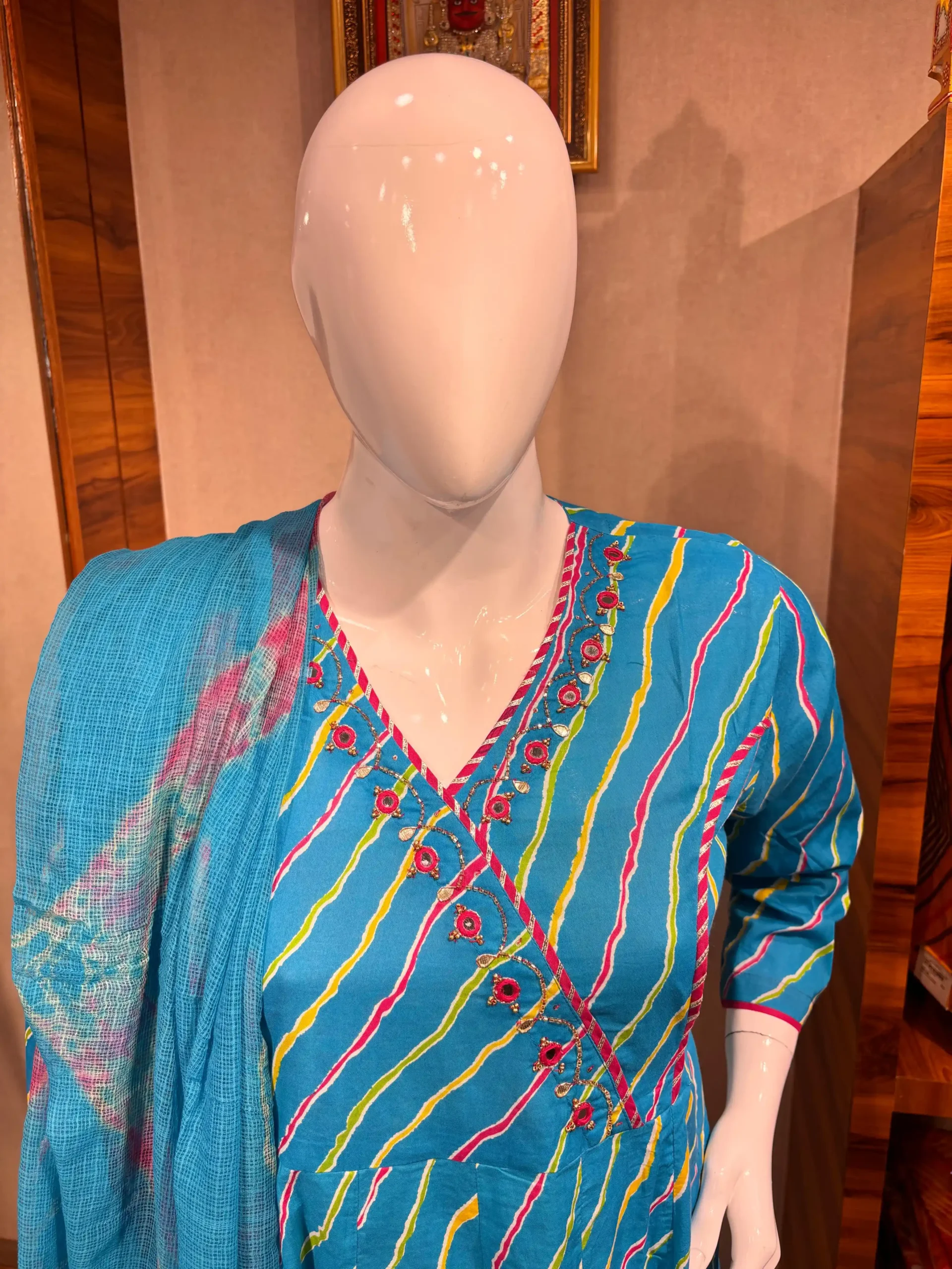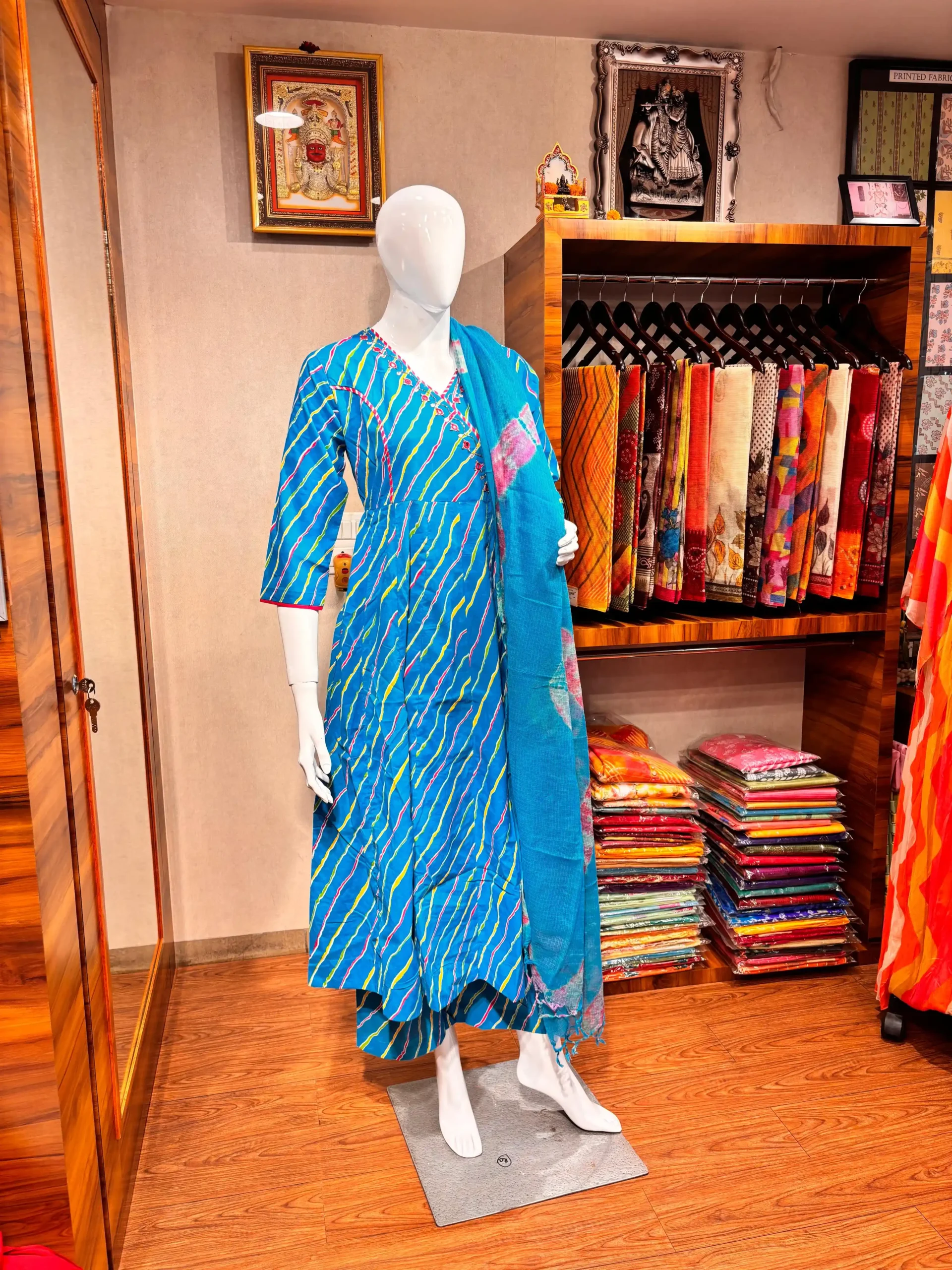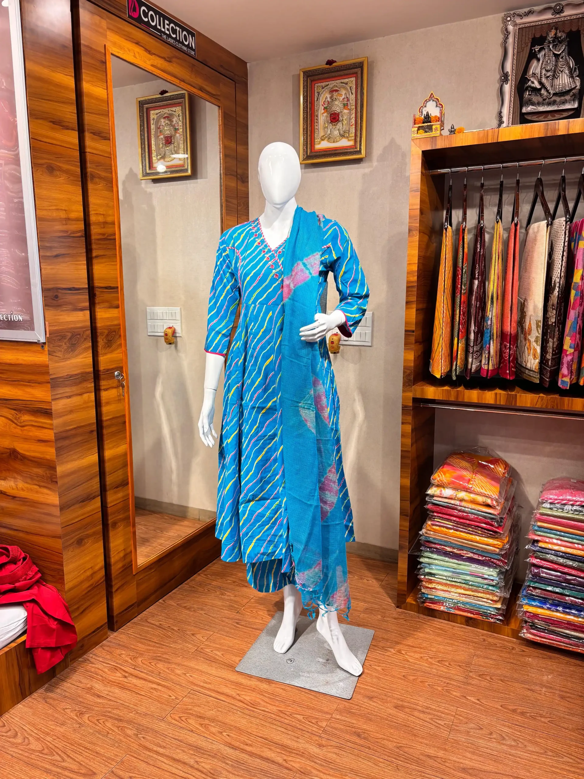 Step into timeless style with the Yunara A-Line Leheriya Kurti Set, a graceful ensemble crafted to reflect India’s rich cultural heritage. Designed in a soothing blue color palette, this outfit includes a stylish A-line kurti, coordinated pants, and a premium Kota Doriya dupatta that completes the ethnic look with elegance.