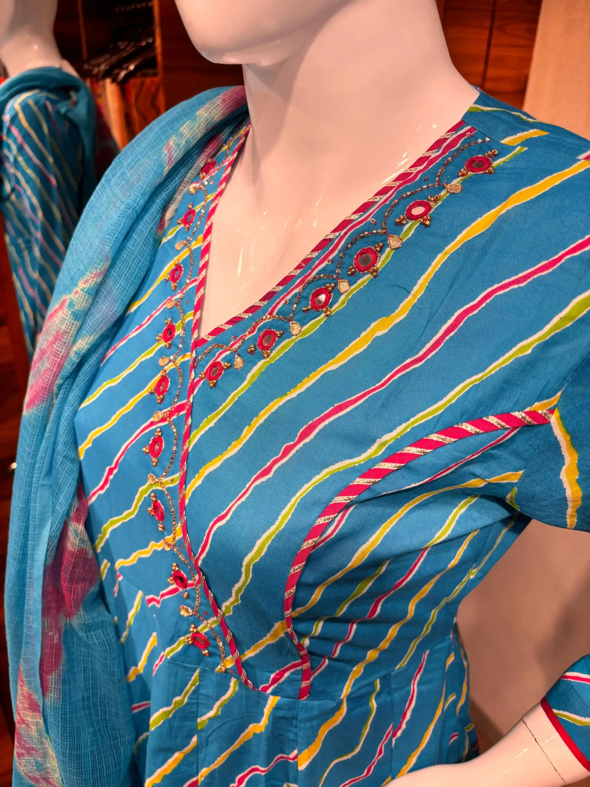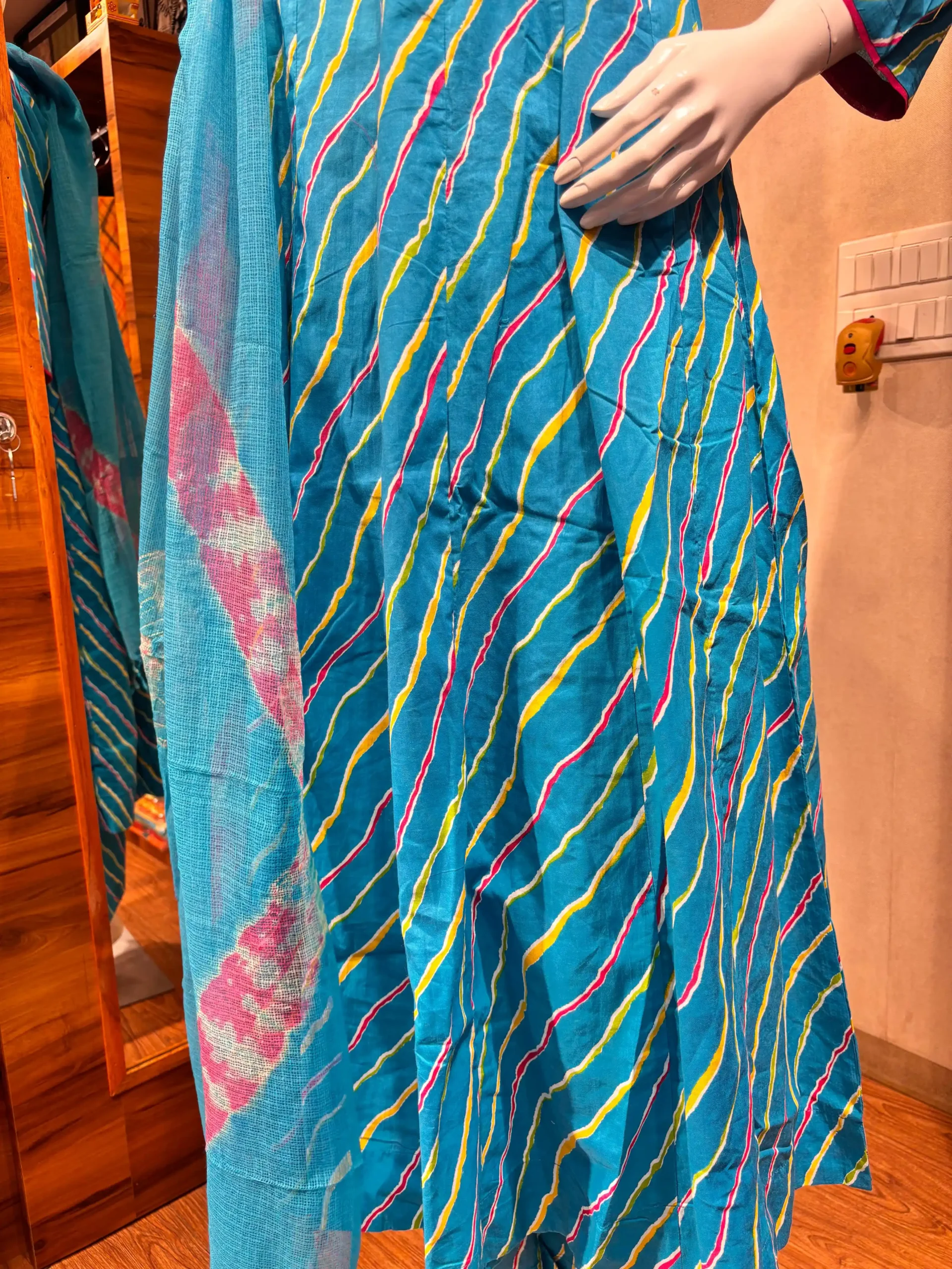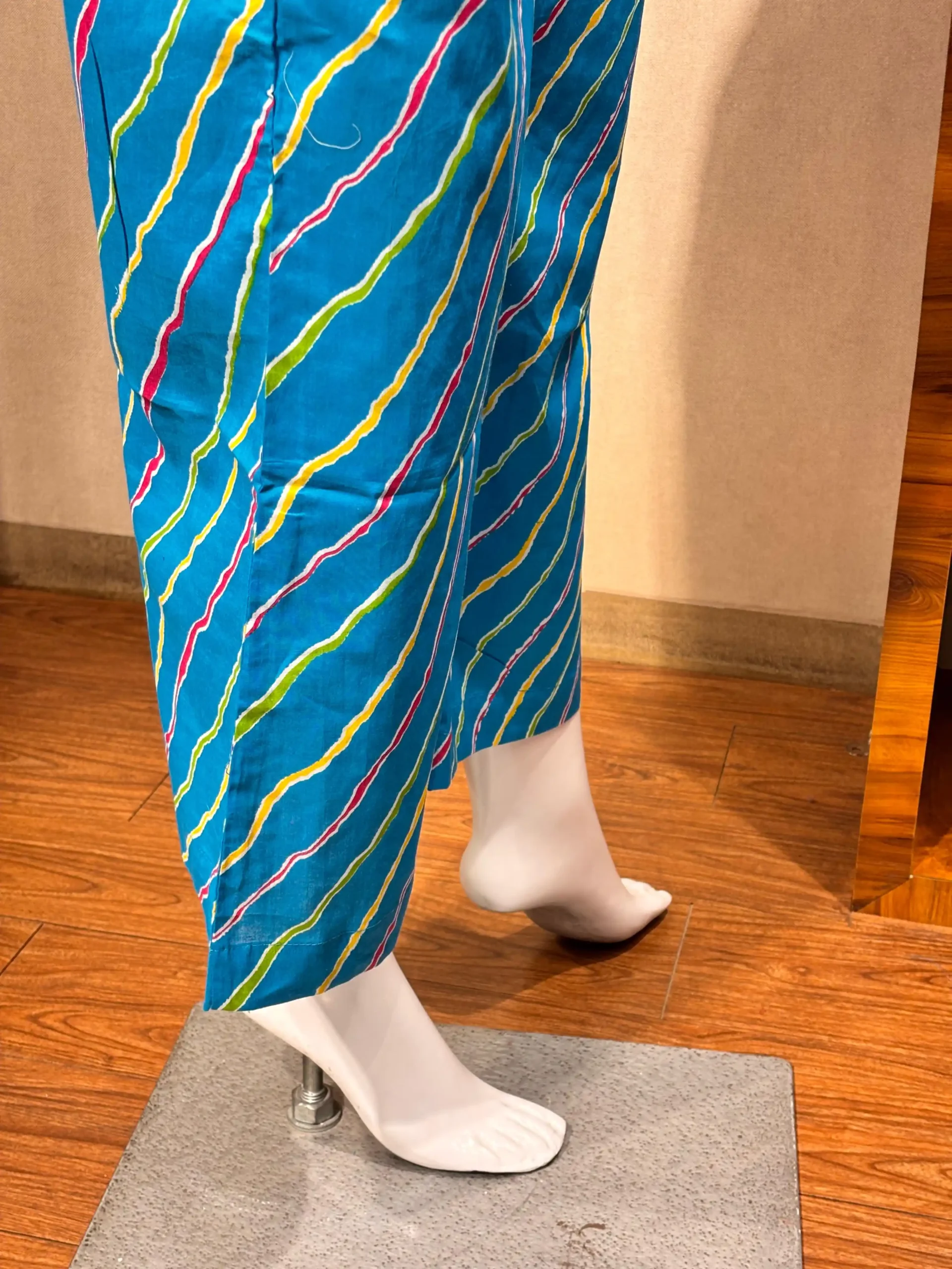 Embrace elegance with Yunara’s blue leheriya A-line kurti set, styled with matching pants and a lightweight Kota Doriya dupatta. A perfect blend of tradition and modern comfort for festivals, parties, and everyday ethnic fashion.