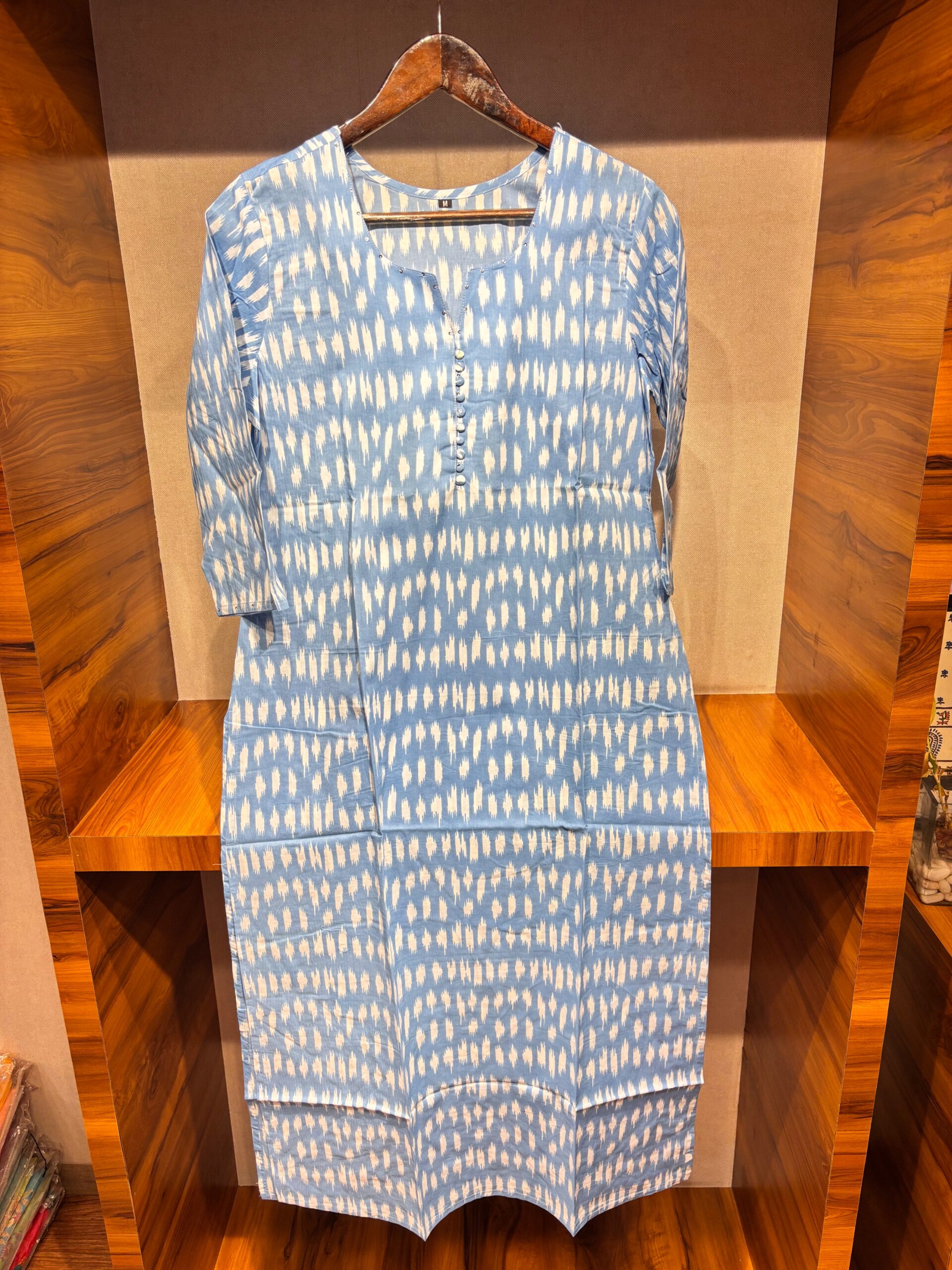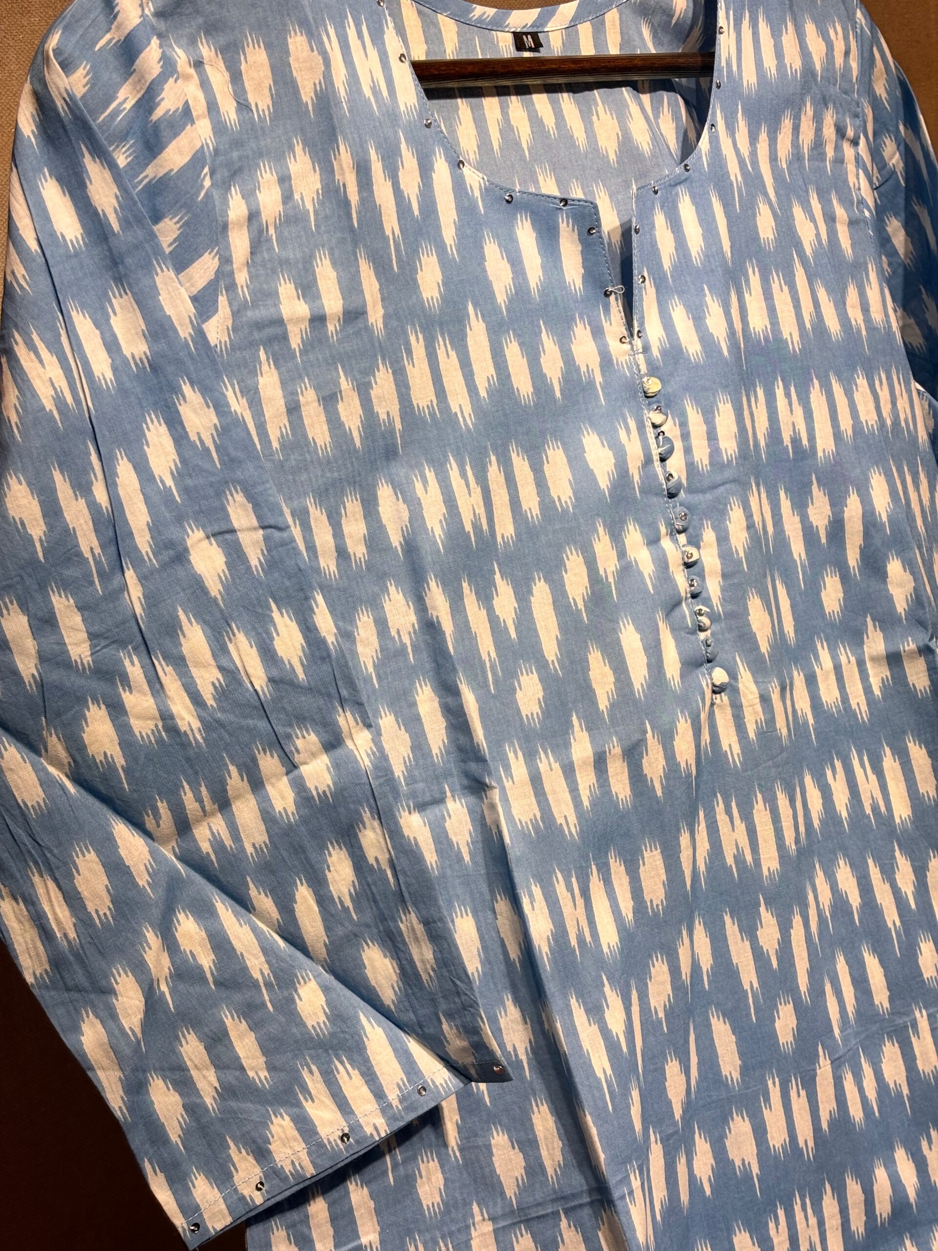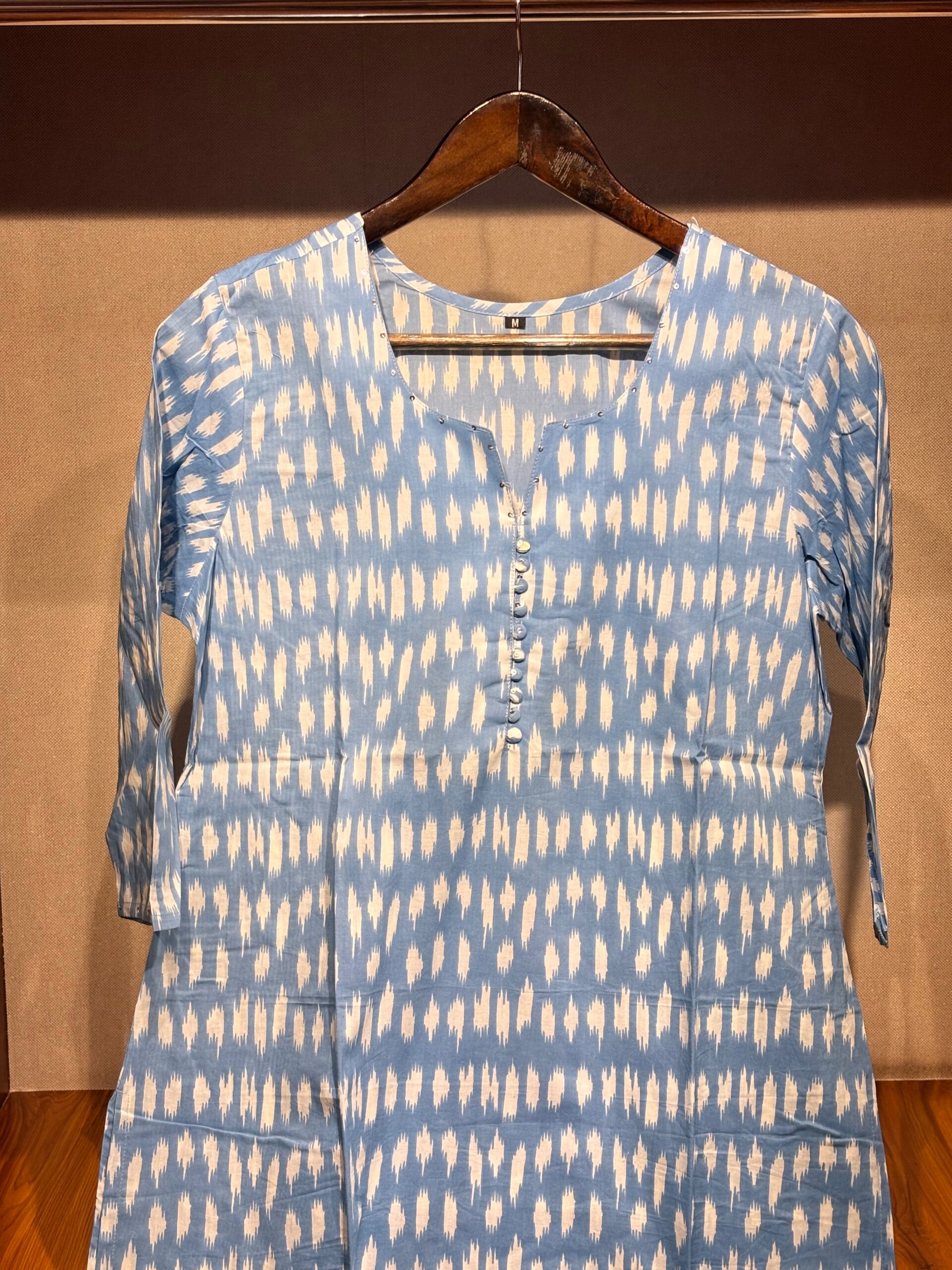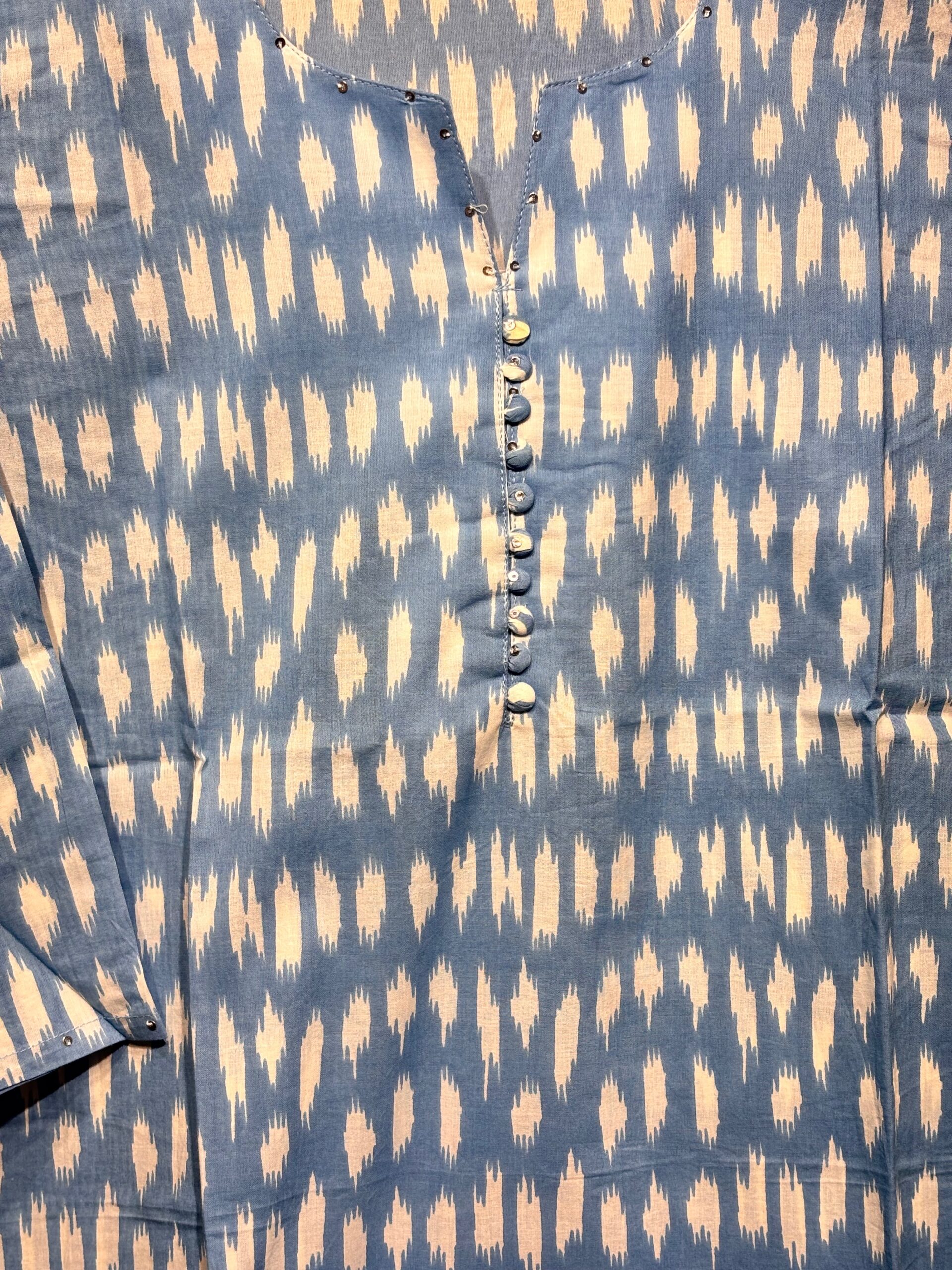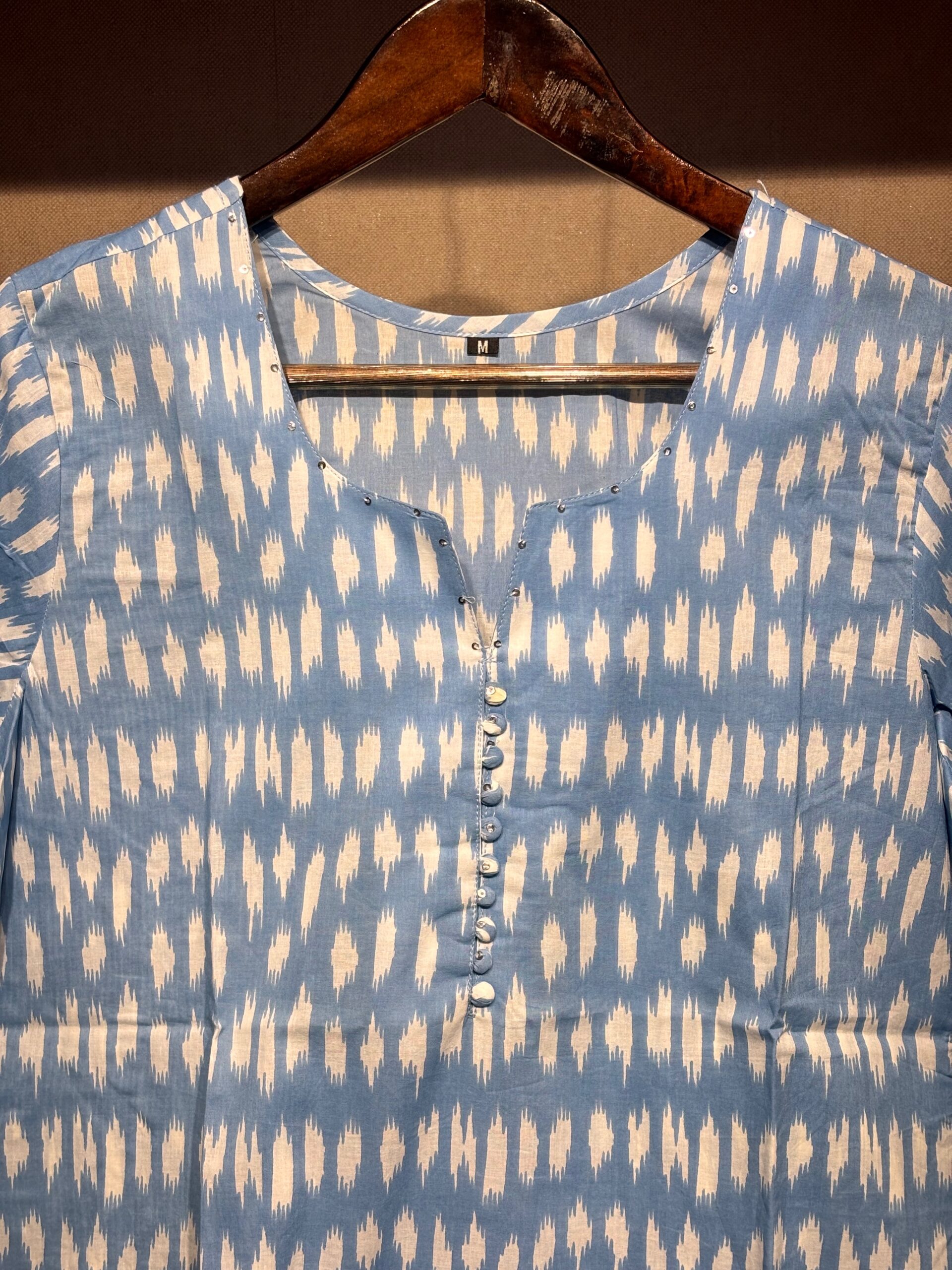 Add a serene touch to your wardrobe with this Yunara light blue cotton kurti featuring delicate white prints. Soft, breathable, and perfect for casual or festive wear.