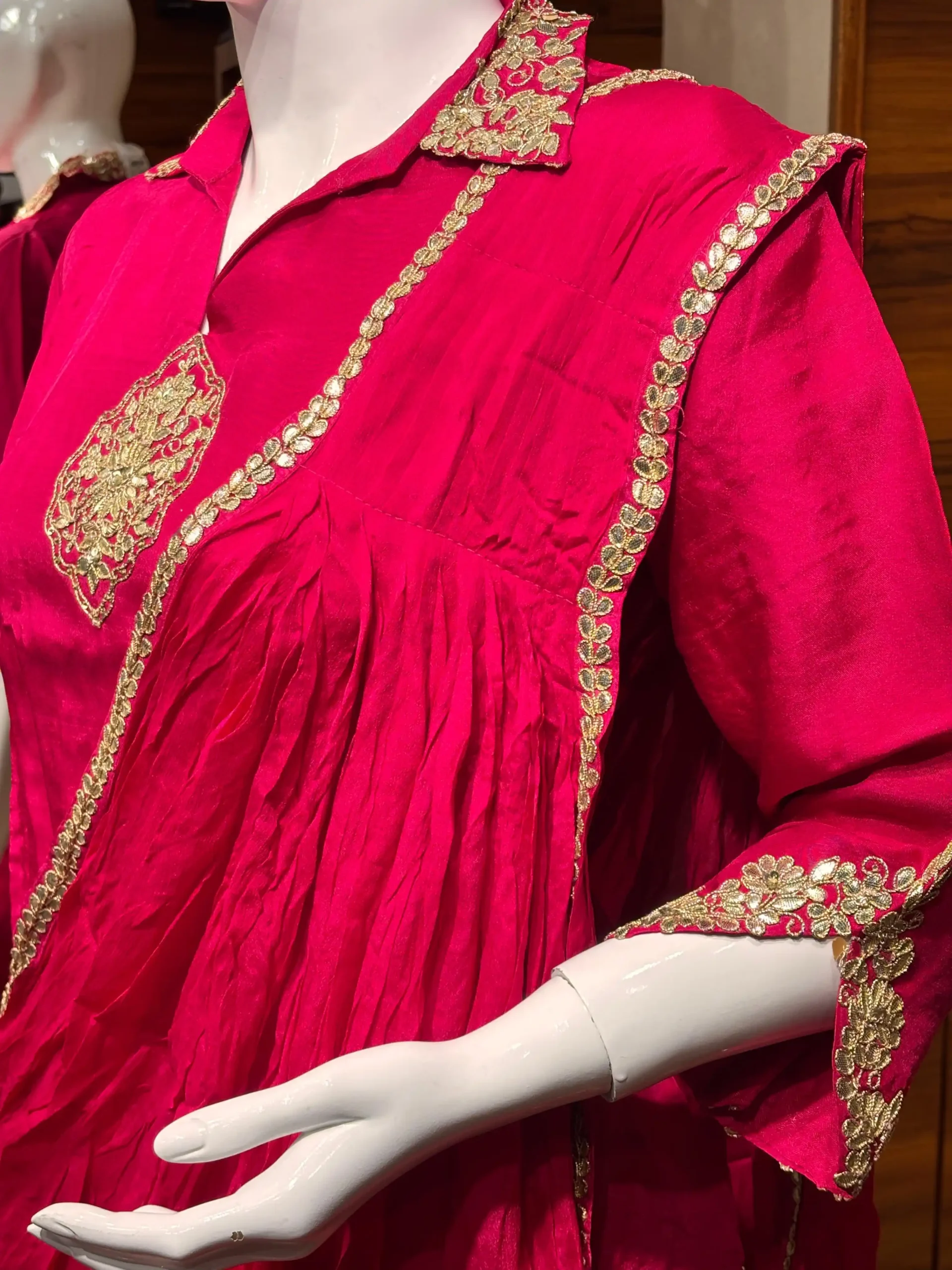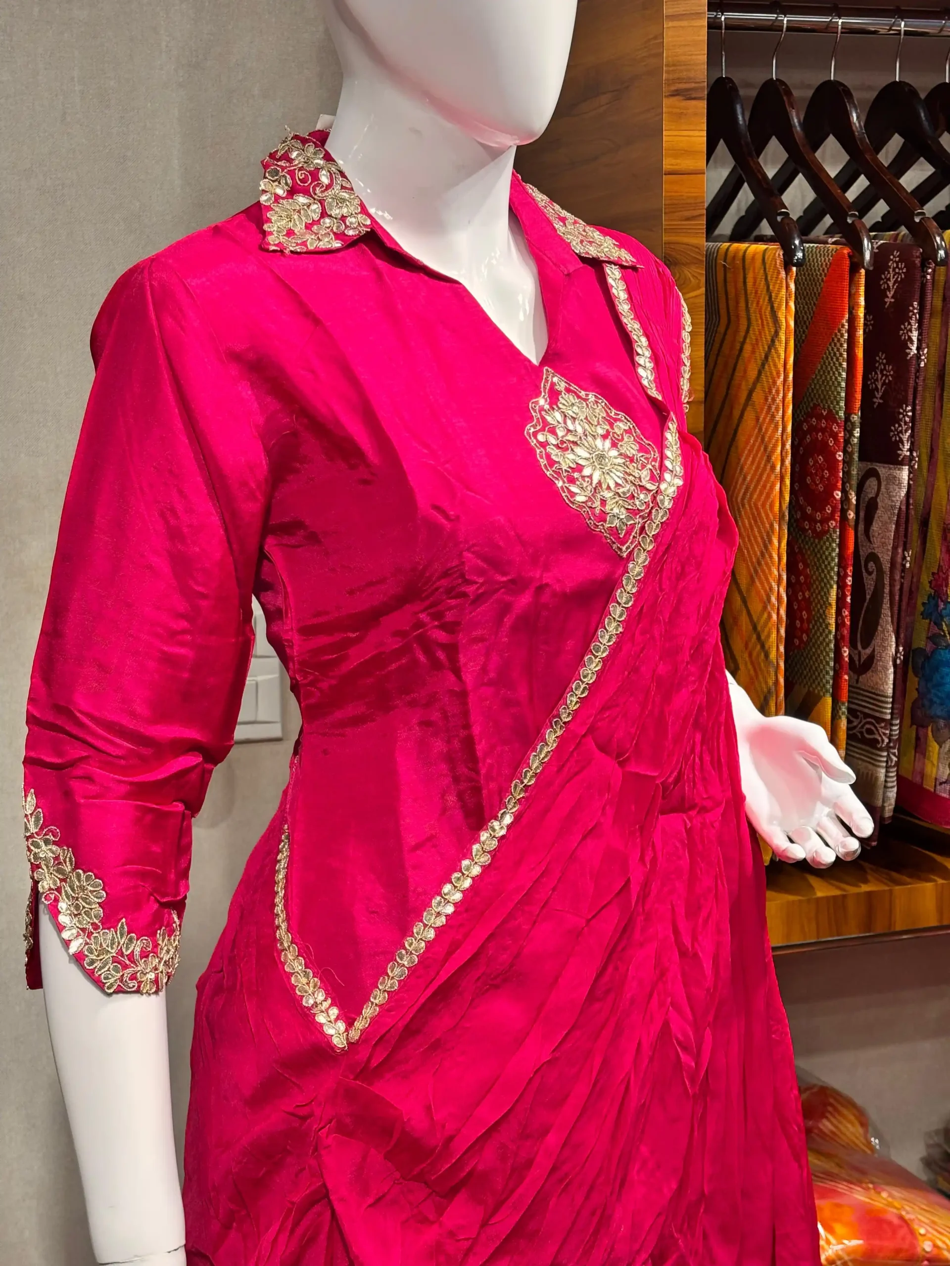 The lehenga is adorned with handcrafted Gota Patti work, adding a festive sparkle and artisanal richness to the outfit. Paired with a stylish short kurti, the ensemble redefines ethnic wear by blending the charm of heritage craft with modern silhouettes. The Indo-Western styling ensures versatility — equally perfect for weddings, sangeet nights, receptions, and festive gatherings.