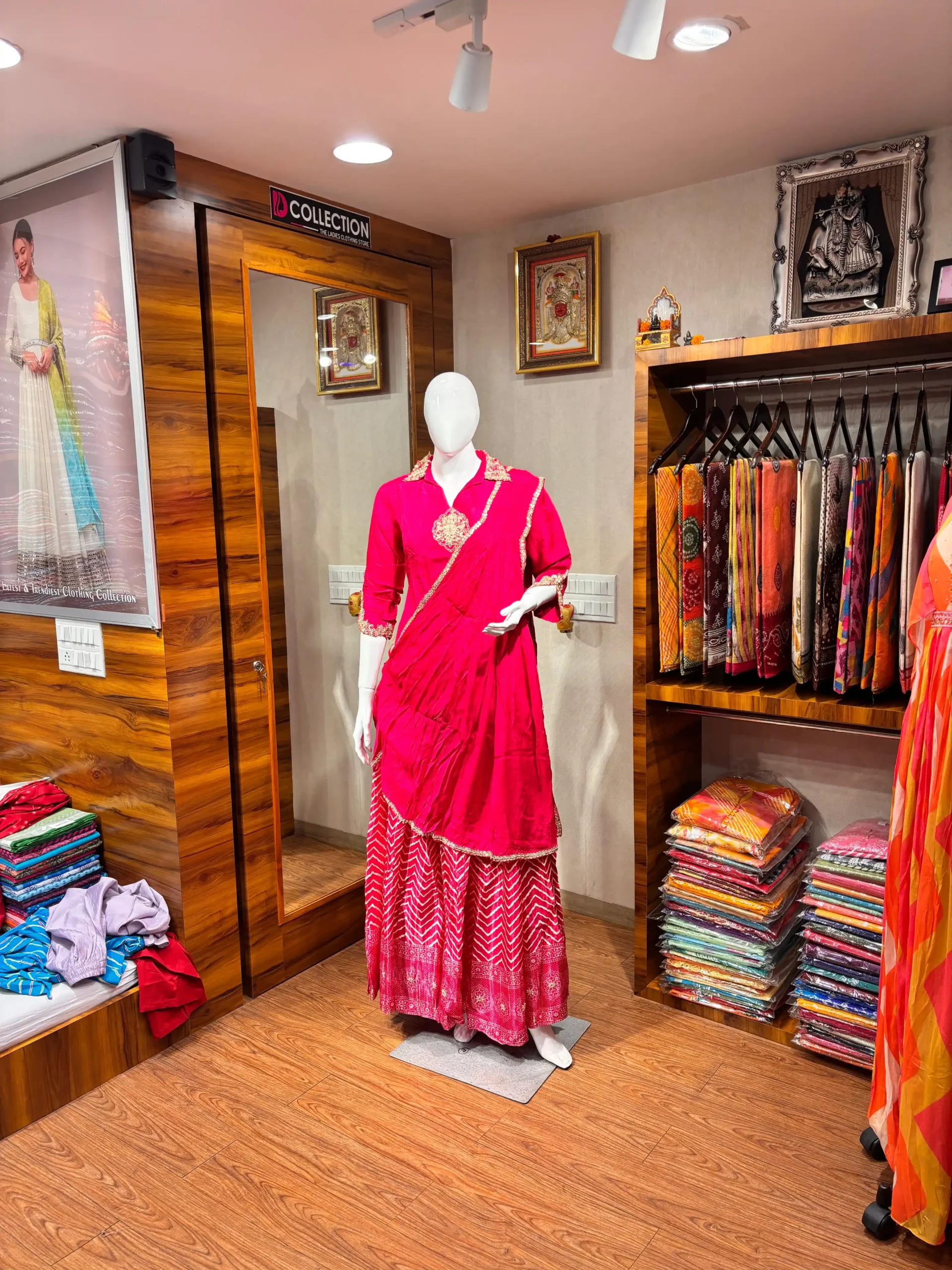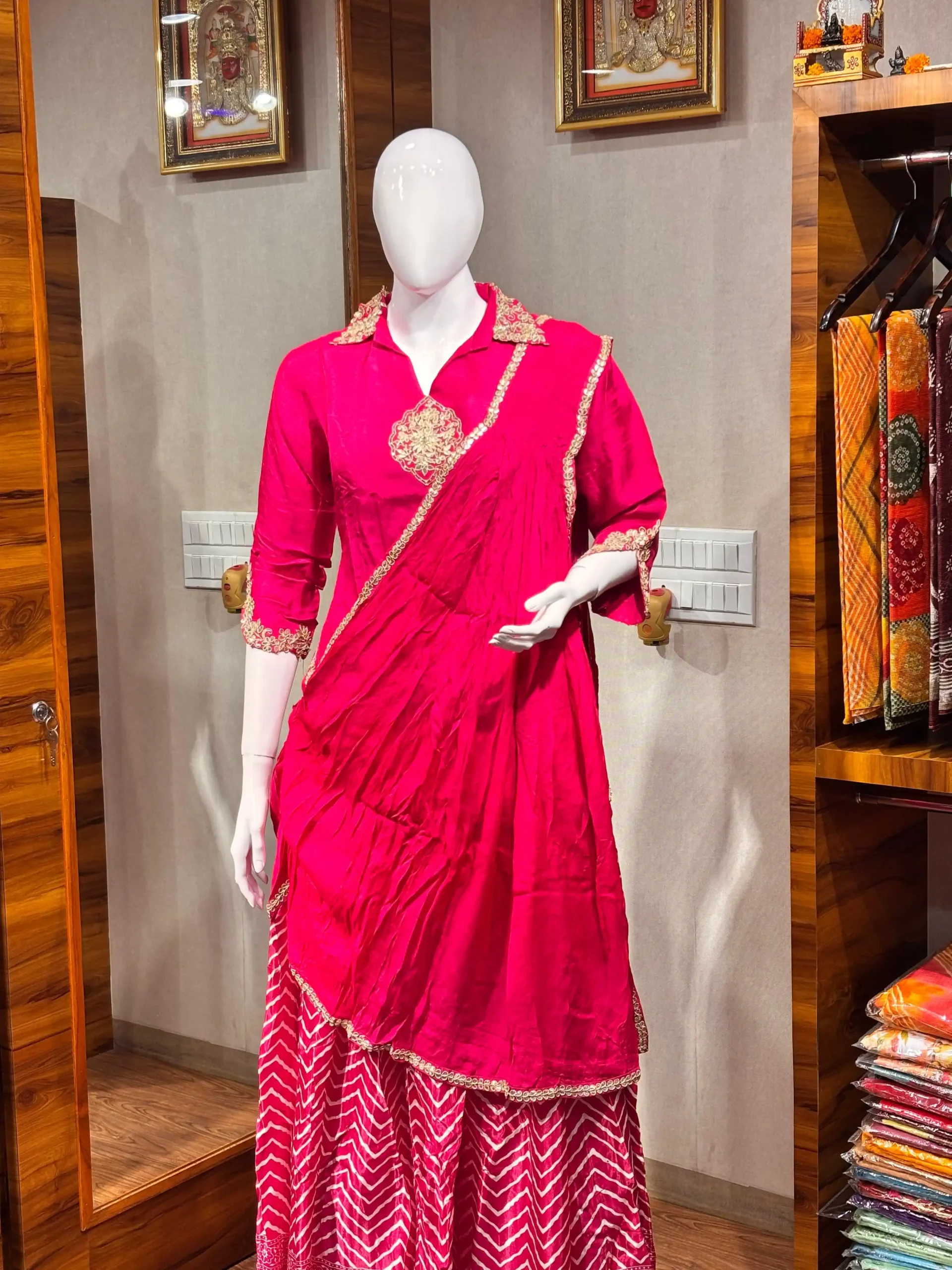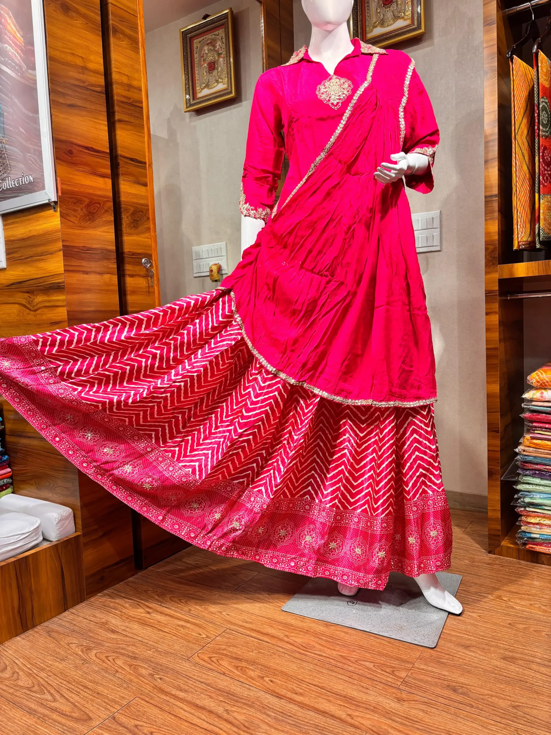 Make a regal statement with Yunara’s Pure Gazzi Silk Indo-Western Lehenga in vibrant Rani pink, featuring a leheriya pattern, intricate Gota Patti work, and a chic short kurti. Perfect for weddings, sangeet, and festive celebrations.