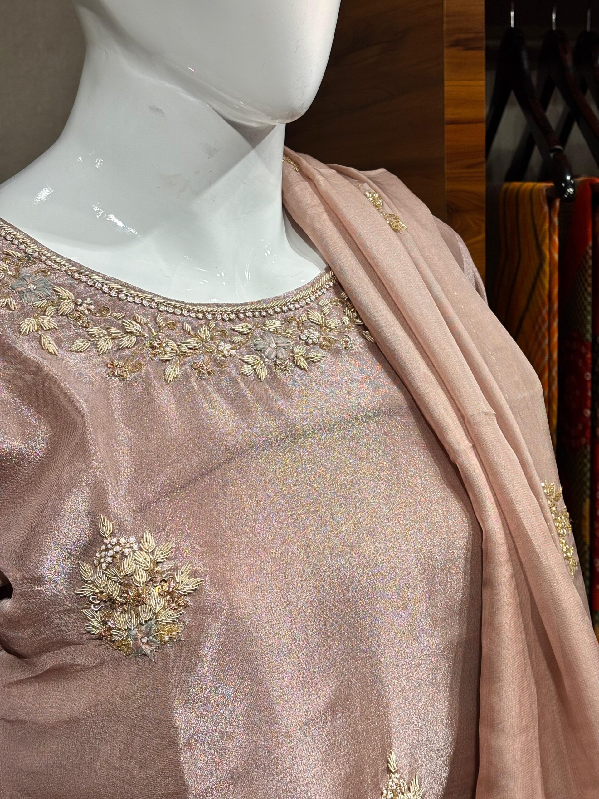 Yunara brings you a regal Pure Tissue Lehenga Set, adorned with exquisite Zardosi hand work. Complete with lehenga skirt, kurti, and dupatta, this ensemble is designed for weddings and festive celebrations.