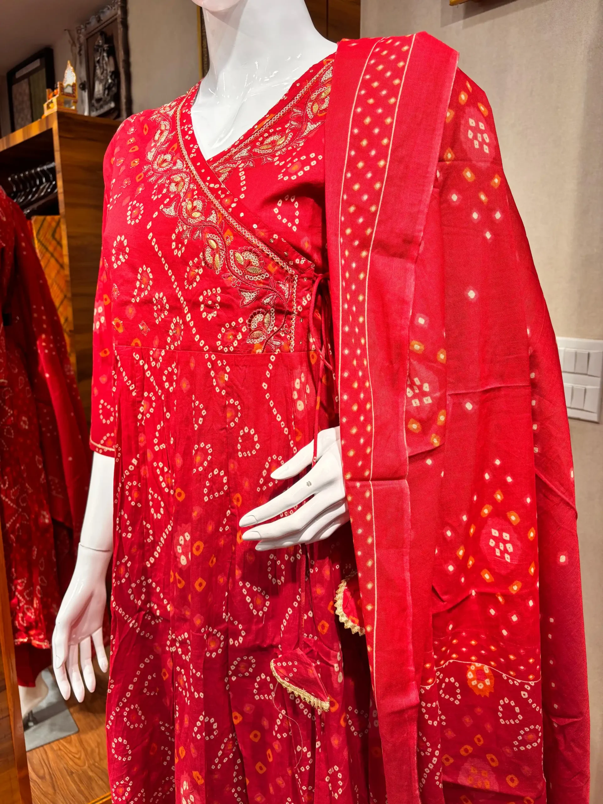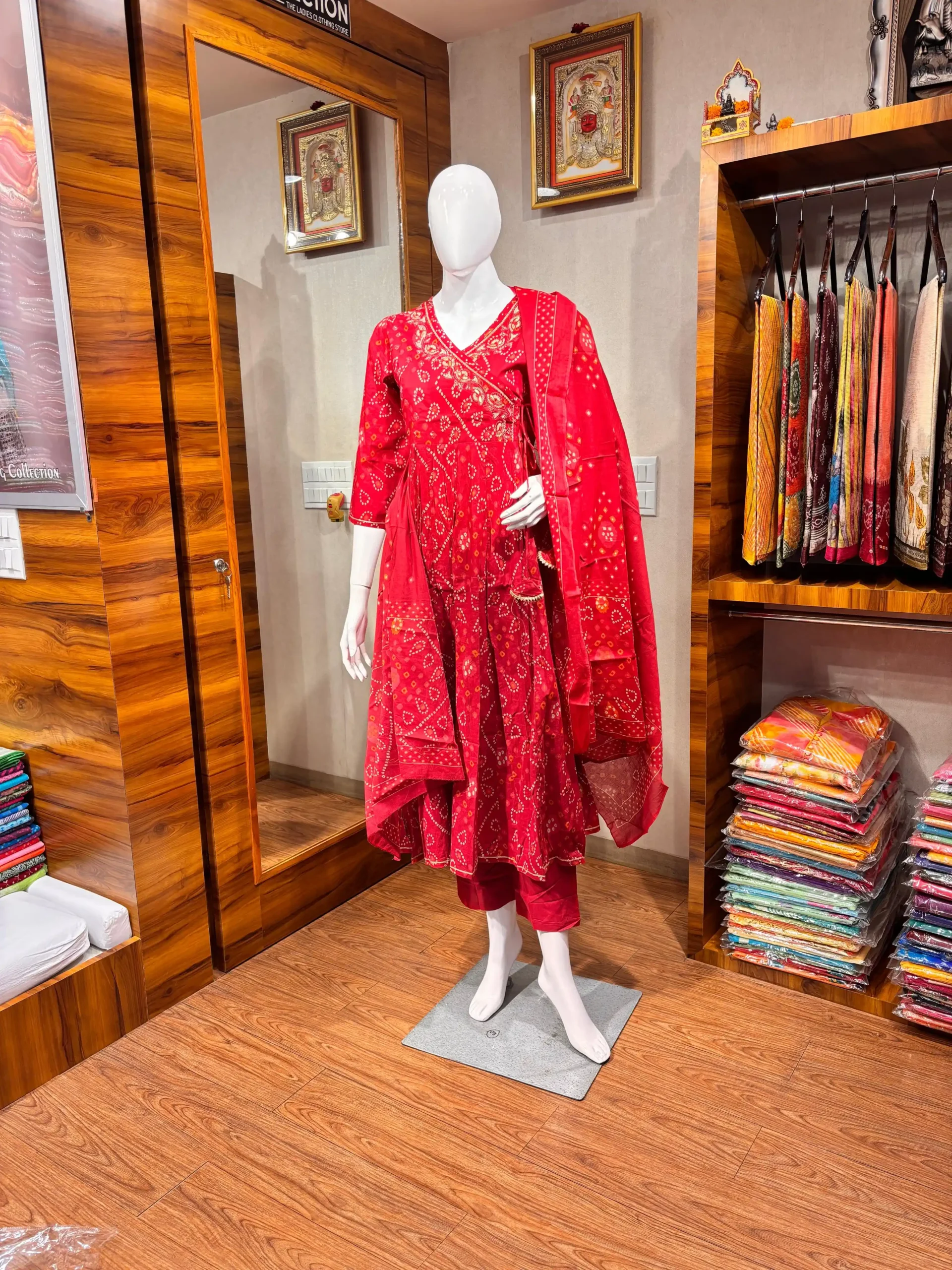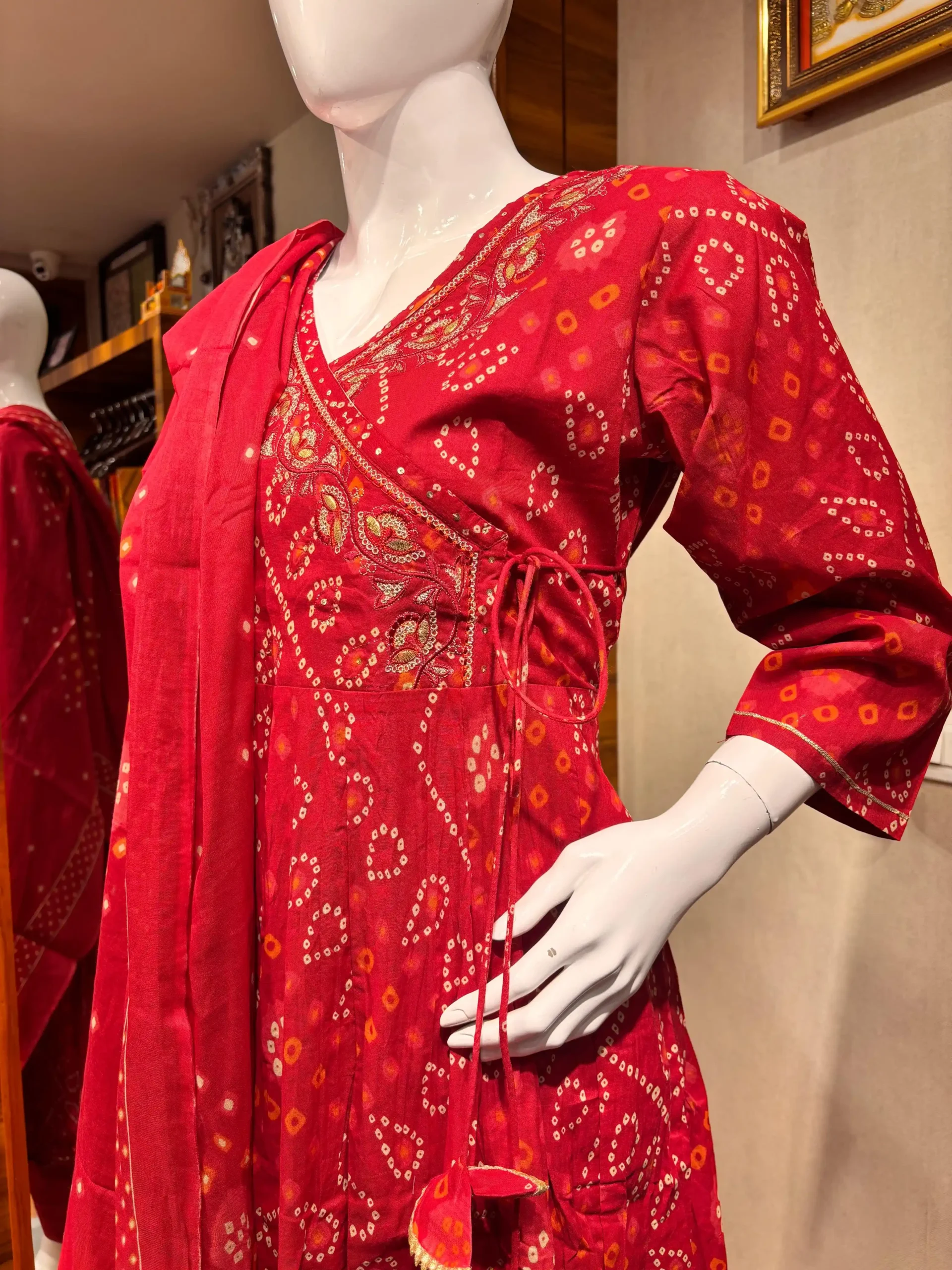 The kurti, designed in a flattering Angrakha silhouette, highlights the timeless beauty of Bandhej patterns, while the breathable cotton fabric ensures day-long comfort. The dupatta, also crafted in authentic Bandhej print, adds a festive charm and traditional appeal to the outfit.