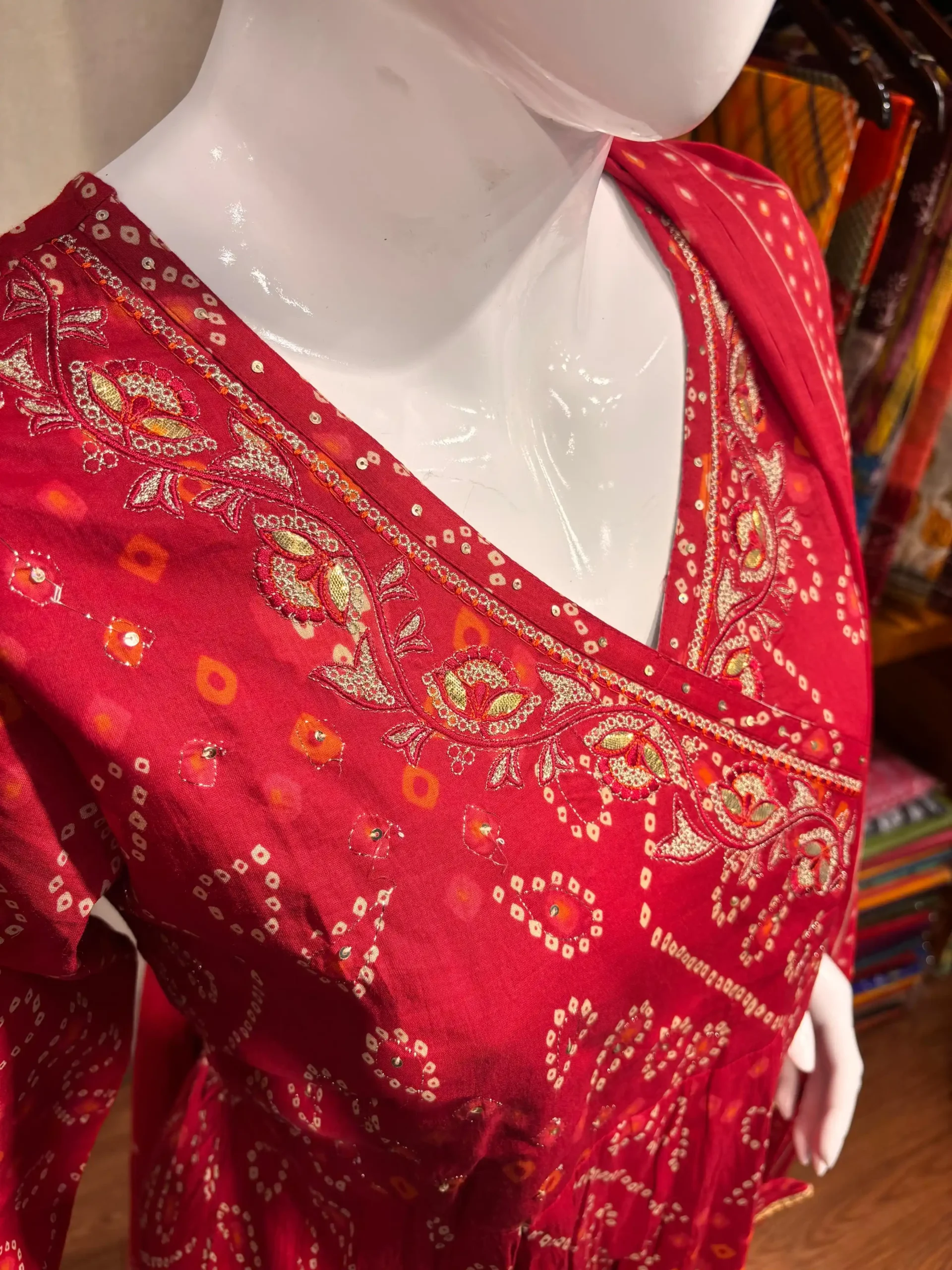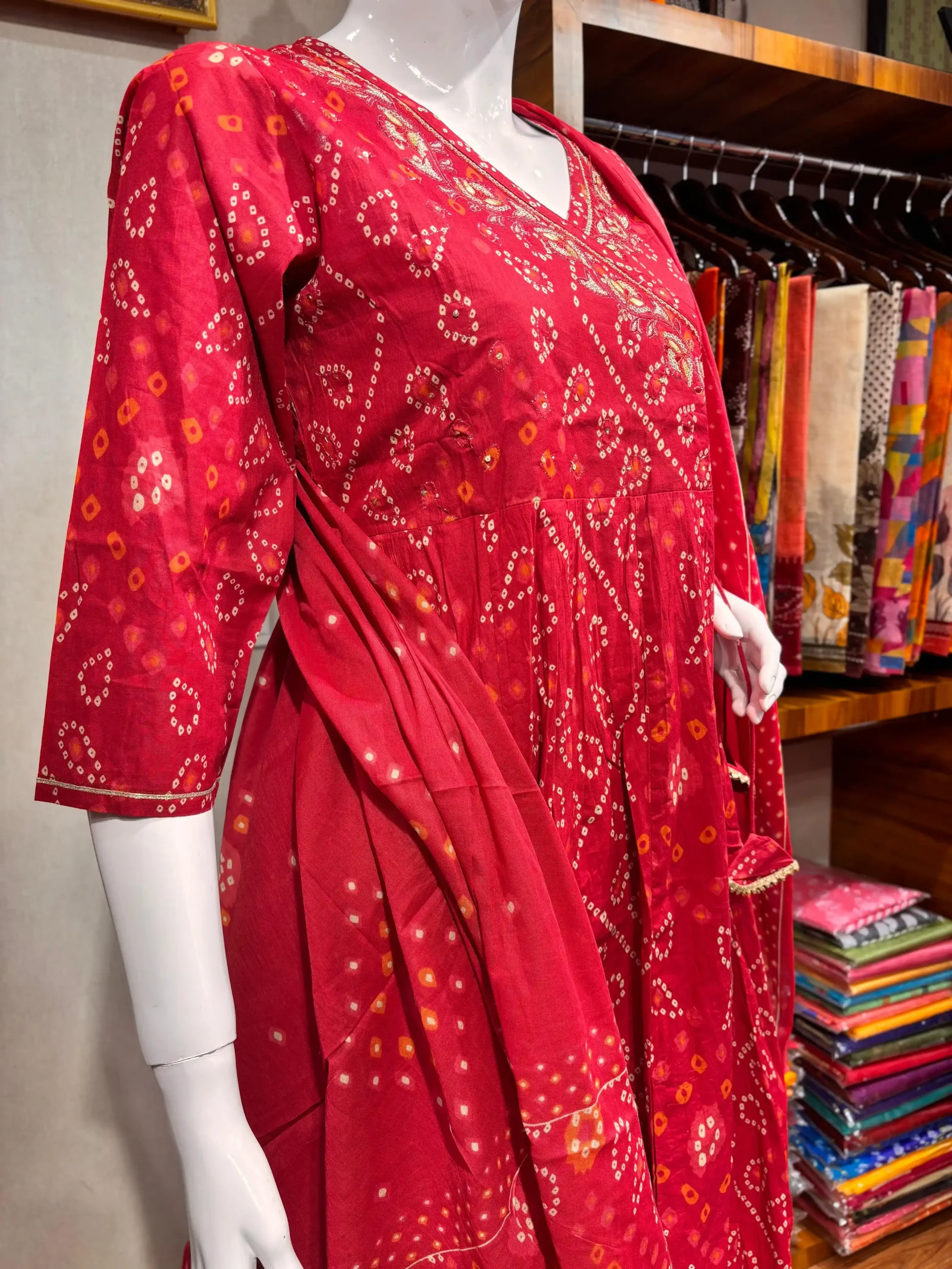 Turn heads in Yunara’s red cotton Bandhej kurti set, styled in a classic Angrakha pattern and paired with comfortable pants and a matching Bandhej dupatta. A festive-perfect three-piece outfit crafted in 100% cotton.